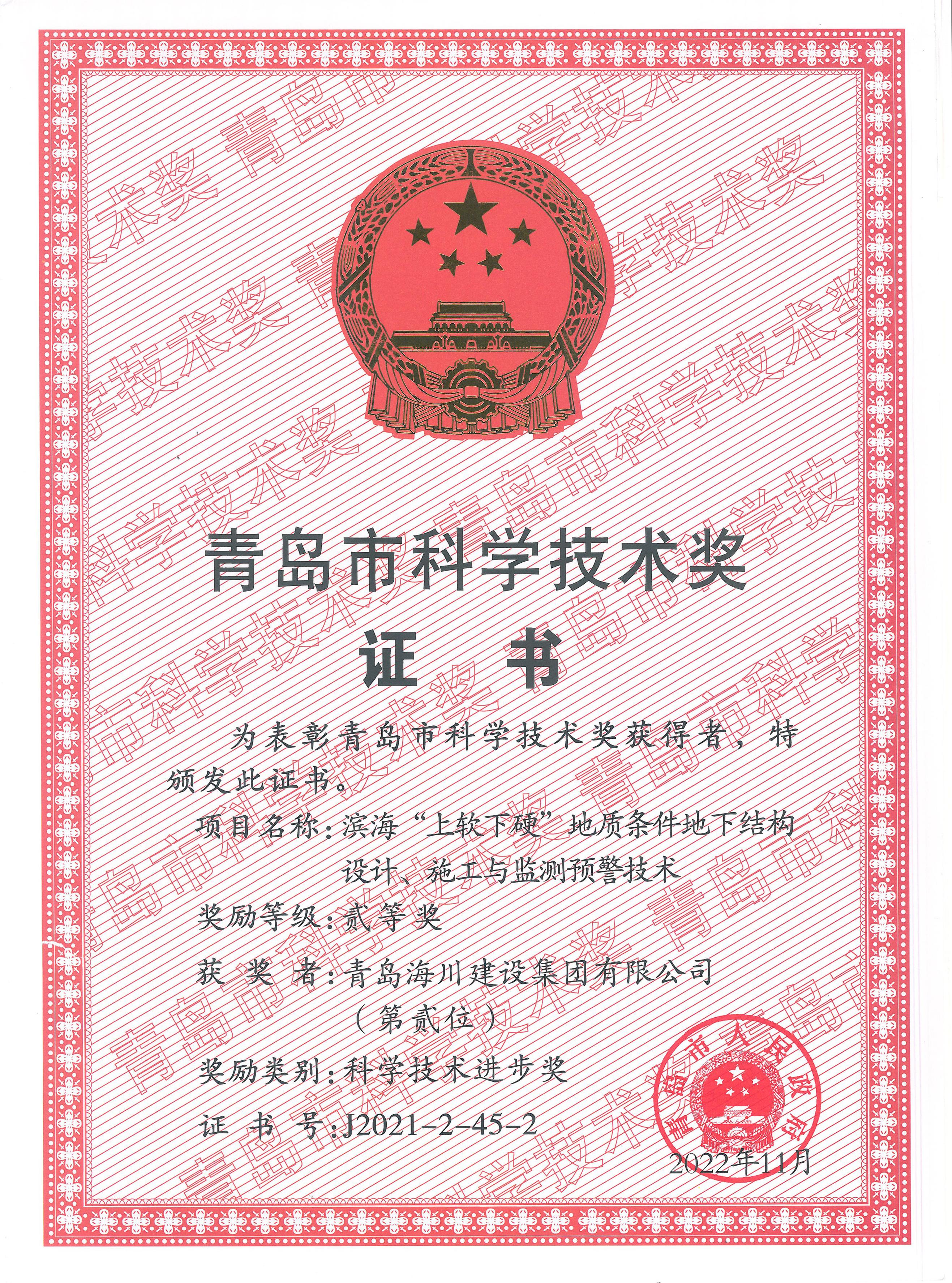 海川集團(tuán)榮獲青島市科學(xué)技術(shù)獎(jiǎng)2023-03-06近日,集團(tuán)公司領(lǐng)回了“青島市科學(xué)技術(shù)獎(jiǎng)”榮譽(yù)證書。經(jīng)青島市市科學(xué)技術(shù)獎(jiǎng)勵(lì)評(píng)審委員會(huì)評(píng)審、青島市市科學(xué)技術(shù)獎(jiǎng)勵(lì)委員會(huì)核定,市政府決定,由青島理工大學(xué)與青島海川建設(shè)集團(tuán)有限公司聯(lián)合申報(bào)的《濱?!吧宪浵掠病钡刭|(zhì)條件地下結(jié)構(gòu)設(shè)計(jì)、施工與監(jiān)測(cè)預(yù)警技術(shù)》獲得科學(xué)技術(shù)進(jìn)步獎(jiǎng)二等獎(jiǎng)。課... -