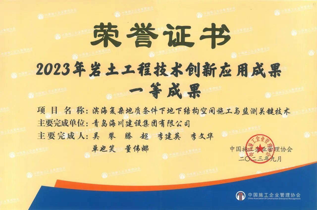 創(chuàng)新賦能 科技爭先 | 青島海川建設(shè)集團(tuán)榮獲多項(xiàng)科技成果獎(jiǎng)勵(lì)2023-10-08近日,中國施工企業(yè)管理協(xié)會(huì)公布了2023年度巖土工程技術(shù)創(chuàng)新應(yīng)用成果的通知,青島海川建設(shè)集團(tuán)研究課題《濱海復(fù)雜地質(zhì)條件下地下結(jié)構(gòu)空間施工與監(jiān)測(cè)關(guān)鍵技術(shù)》榮獲一等成果,該成果為集團(tuán)公司首次獲此殊榮,也是本年度青島市唯一一等獎(jiǎng)獲獎(jiǎng)獎(jiǎng)項(xiàng)。近年來,海川建設(shè)始終堅(jiān)持以科技為本,以... -