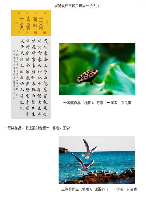 海川集團(tuán)員工在海川書畫攝影研究會的牽頭下積極參與此次展覽,創(chuàng)作精力充沛,在短短一周內(nèi)創(chuàng)作作品數(shù)十幅。展覽期間,主辦單位共收到各類參展作品294幅,其中:書法類作品83幅,繪畫類作品65幅,攝影類作品139幅,手工才藝類作品7件。在此次展覽中海川集團(tuán)員工周天馬、丁磊、孫良青、楊興強(qiáng)、寧楊、王森的作品入展并在市城鄉(xiāng)建委一樓大廳展出。這些作品主題鮮明、風(fēng)格多樣。在展覽后評獎中,孫良青攝影作品《呼吸》獲攝影作品一等獎,《比翼齊飛》獲三等獎;王森《書法篆刻合璧》獲書法類一等獎。
