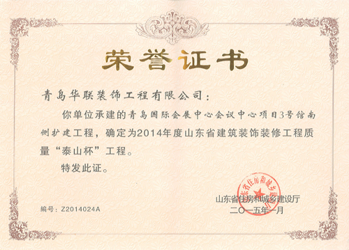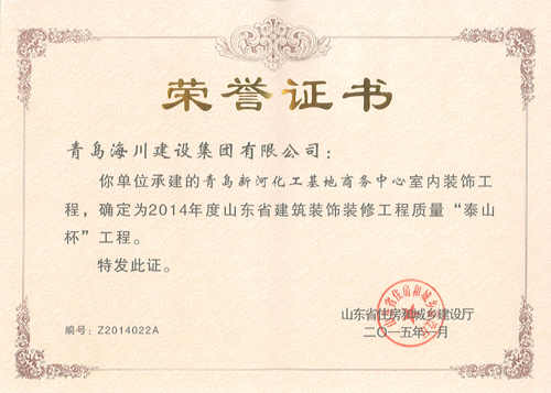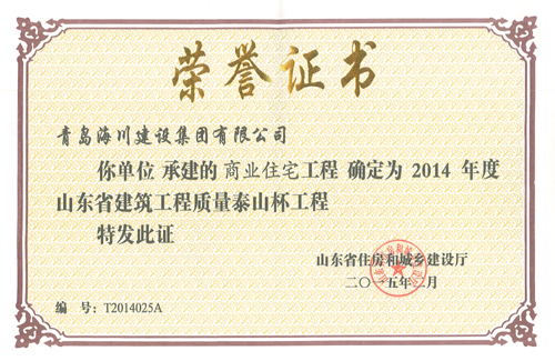 近日,公司從山東省住房和城鄉(xiāng)建設(shè)廳捧回五項(xiàng)泰山杯獎證書,其中2014年度山東省建筑工程質(zhì)量泰山杯工程證書三項(xiàng);2014年度山東省建筑裝飾裝修工程質(zhì)量“泰山杯”工程證書兩項(xiàng)。