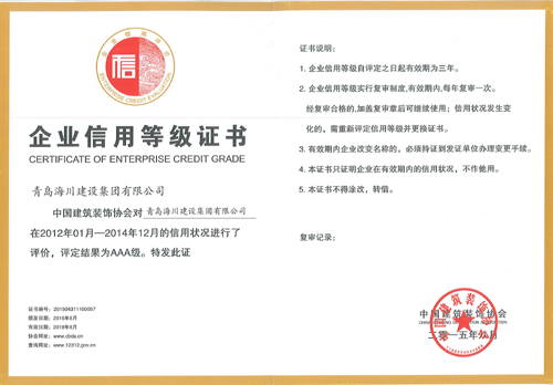 近日,海川集團(tuán)從中國(guó)建筑裝飾協(xié)會(huì)捧回“企業(yè)信用評(píng)價(jià)AAA級(jí)信用企業(yè)”獎(jiǎng)牌和證書。該證書是中國(guó)建筑裝飾協(xié)會(huì)對(duì)海川集團(tuán)在2012年1月—2014年12月的信用狀況進(jìn)行評(píng)價(jià),并評(píng)定為AAA級(jí)后于2015年8月予以頒發(fā)的,有效期三年,至2018年8月。
