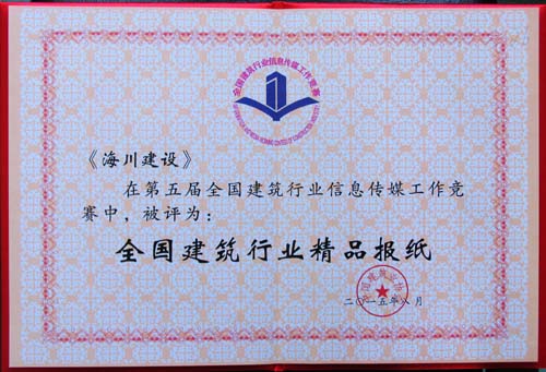 8月26日,中國(guó)建筑業(yè)協(xié)會(huì)在大連召開(kāi)的全國(guó)建筑行業(yè)信息傳媒工作經(jīng)驗(yàn)交流會(huì)上,向第五屆全國(guó)建筑行業(yè)信息傳媒工作競(jìng)賽的優(yōu)勝者頒發(fā)了獎(jiǎng)杯和榮譽(yù)證書(shū)。海川集團(tuán)被評(píng)為“全國(guó)建筑行業(yè)信息宣傳先進(jìn)集體”,公司網(wǎng)站被評(píng)為“全國(guó)建筑行業(yè)精品網(wǎng)站”,《海川建設(shè)》企業(yè)報(bào)被評(píng)為“全國(guó)建筑行業(yè)精品報(bào)紙”,王修岐同志被評(píng)為“全國(guó)建筑行業(yè)信息宣傳優(yōu)秀工作者”。