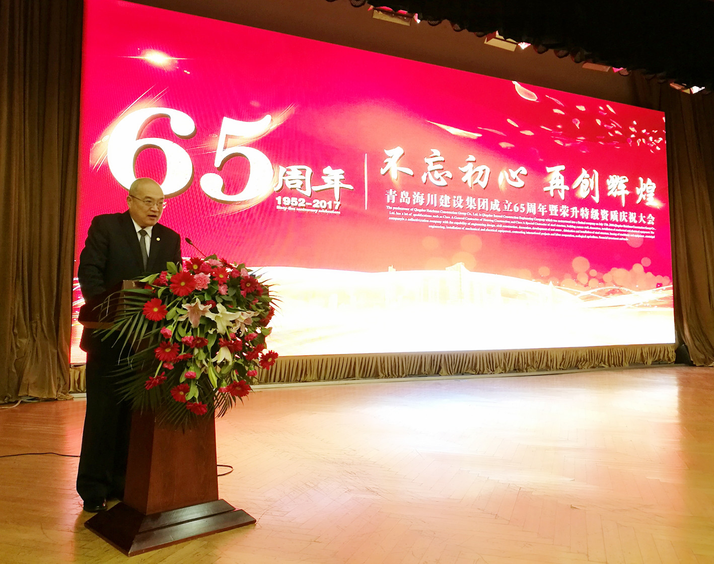 2017年12月29日上午,青島海川建設集團成立65周年暨榮升特級資質慶祝大會在黃海飯店隆重舉行。蒞臨現場的嘉賓有:原二建公司經理陳樹業(yè)、原二建公司經理國常光、原二建公司經理鄭同慶,青島建設集團建興工程有限公司董事長逄振輝、青建隆泰興業(yè)建設有限公司總經理趙錫業(yè)、青島建設裝飾集團有限公司董事長張波等領導。海川建設集團董事長吳鑫、總裁仇建軍和公司股東、理事會成員、企業(yè)中層管理人員200余人參加,共同見證海川建設集團在改革奮進歷程當中砥礪前行的輝煌成果。